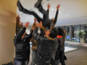 ちなみに、この写真は、打ち上げが盛り上がって、なぜか、胴上げされるアプレンティスの講師、寺本。