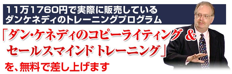 そんな方のためにダン・ケネディのトレーニングプログラム「コピーライティング&セールスマインドトレーニング」を無料で差し上げます。これは、アメリカでは実際に1397ドル(約11万1760円)で販売されているものの日本語版です。