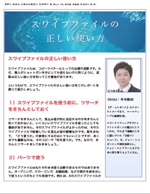 これは、あなたがコピーライターとして、実際にコピーを書くとき、スワイプファイル(過去の上手くいった広告のお手本、実例をストックしたもの)をどのように活用するかを解説したレポートです。