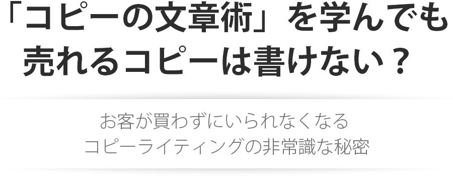そんなコピーライティングの隠された非常識な真実を知って初めて、あなたは売れるコピーを書くことができるのです。それを知らなければ、あなたはいくらコピーの文章術を磨いたり、売れるコピーをマネしても、いつまでもあなたのコピーで反応を増やしたり、商品を売ることはできないのです。